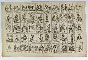 Zincographies (?), sur papier vélin, +/- 45 x 30 cm. Divisées en nombreuses petites cases avec dessins et rébus, 1 pl. avec mention "Paris, Vve Gardin".