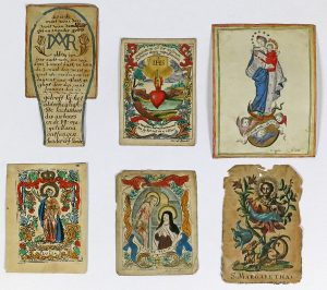 Vue d'optique : "Vue perspective du Couvent Garden". P., Chéreau, s.d. E.-f. part. rehaussée, 25,2 x 33,2 cm.-- Images d'Épinal rehaussées (3) : horloge de crédit et 2 scènes de bataille (1 avec piqûres, l'autre brunie, collée par les coins sur 1 f. et avec déch. marg.).-- Images pieuses (27) : 14 en noir dont faire-part de décès et 13 en couleurs dont 2 sur peau de vélin et 1 canivet (rouss., us.).