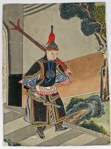 Guerrier. Gouache originale, 32 x 24 cm (doublée de papier fort, pet. manques aux bords, qqs rouss.).-- Buffle monté par un homme tenant un sac. Lavis à l'encre noire, 52 x 40 cm, texte et cachet en bas à dr. (plis). Représentation zodiacale du buffle ?-- 2 très grands bois aquarellés, 110 x 60 cm et 50 x 60 cm représentant le panthéon chinois (?) et les occupations des femmes dans une sorte de gynécée.-- 2 grands bois aquarellés représentant des enfants jouant, +/- 50 x 30 cm.-- Couple devant une pagode. Papiers de couleur découpés, 25 x 12 cm.