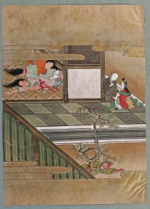 Gouache avec REHAUTS d'OR, 31 x 22 cm, sur fin papier, collée par les coins dr. sur un carton (pet. déchirure sur 2 cm à g., plis au coin dr. inf.). Dans une maison gisent les cadavres de trois femmes et d'un homme rouge et poilu (mauvais génie ?) tandis qu'un moine et une noble en belle tenue parlent.