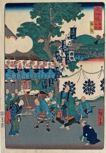 Daikokuya Kinnosuke [ Kinjirô], Bunkyû 3 [Sanglier] [ 1863]. Ôban tate-e, signé Hiroshige ga, cachet aratame daté [Sanglier 4] (marges conservées, bonne condition). Jolie scène de cette suite réalisée par plus de 15 artistes de l'école Utagawa et dont le nombre total de vues est le plus important sur cette thématique (entre 130 et 150 estampes répertoriées à ce jour). Cette suite commémore le trajet du shogun Iemochi rendant hommage à l'empereur.