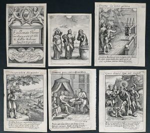 Emblemata nova. London, P. Stent, [c. 1655]. 9 (sur 11) eaux-fortes, TC 8,5 x 6,9 cm + pet. marges, papier vergé non filigrané (6 avec légendes en latin et l'adresse de Stent). RARISSIME. Second état (sur 3); # Pennington 446-448, 450,451, 453-456; cachet Fürstl. Waldburg. Kupferstichkabinet, Wolfegg (# Lugt 2542).-- Rex et Regina de Tunis [d'après Leonardo da VINCI (1459-1519)]. Cuv. 6 x 12,3 cm + pet. marges, papier vergé non filigrané. Second état (sur 2); # Pennington 1603.-- L'archange conduisant Tobias [d'après Adam ELLSHEIMER (1574-1610)]. E.-f., cuv. 12, x 18,2 cm, papier vergé filigrané.