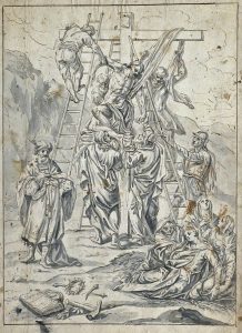 [Fin 17e siècle]. DESSIN ORIGINAL, plume à l'encre bistre et lavis à l'encre grise, 31,7 x 23,2 cm, papier vergé non filigrané (pet. ou faibles taches brunes ou grises). Trois hommes montés sur des échelles descendent le corps du Christ que Saint Jean et deux apôtres accueillent au pied de la Croix. Un soldat romain tenant une échelle, un dignitaire juif, quatre pleureuses assises et des instruments complètent la scène.