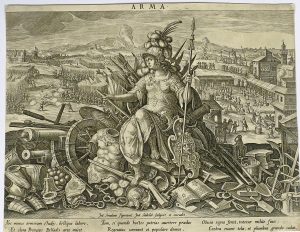 Paysage fluvial avec forteresse sur un rocher [d'après Paulus Bril (1553/1554-1626)]. Cuv. 20,8 x 27,2 cm, papier vergé filigrané (pet. déch. à la marge inf.). Copie inversée, numérotée 3 en bas à dr., légende ms. "Afbeelding van de woestijne des Joodschen Lants"; # Hollstein 578.-- "Arma" [d'après Joannes STRADANUS (1523-1605)]. 21,7 x 27,8 cm, papier vergé non filigrané (rognée au-delà de la cuv.). Belle figuration de la déesse de la guerre; # Hollstein 535.
