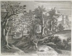 SADELER, Raphaël II (1584-1632).- Paysage avec oiseleur [d'après Pieter II STEVENS (c. 1567-1624)]. Cuv. 20,7 x 27,2 cm + grandes marges, papier vergé non filigrané (déch. sans manque, renforcée à la marge inf.); # Hollstein 54.-- SADELER, Joannes I (1550-c. 1600).- La méchanceté et la violence sur la terre [d'après Maerten de Vos (1532-1603)]. Cuv. 20,5 x 27,4 cm (qqs pet. taches brunes au verso, rognée en-deça de la cuv.); # Hollstein (de Vos) 50.