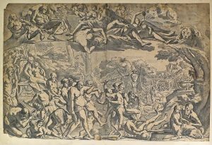 [Cercle ou Suiveur de VAN MANDER, Karel (1548-1606)].- Grande scène mythologique avec musiciens, lutteurs, centaures, amoureux...