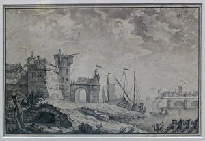 [2e moitié du 17e siècle]. DESSIN ORIGINAL, plume et lavis à l'encre grise, TC 18 x 27,5 cm, papier vergé (pet. taches). Sous passe-partout, vitre et cadre de bois mouluré (non désencadré).