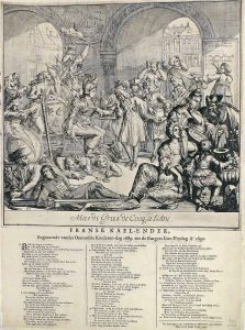 Antwerpen, Cornelis Woons, 1690. Koperets, lijnenkader 37 x 39 cm, totale bladgrootte 55 x 40 cm inclusief letterdruk op 3 kolommen (integraal gekleefd op papieren drager). Grote anonieme spotprent op de onenigheden tussen Willem III en de stad Amsterdam in 1690, geplaatst in de context van de Europese politiek en de Franse expansie onder Lodewijk XIV. Op de achtergrond worden de Doelen en het stadhuis op de Dam voorgesteld. Bij elk van de 12 allegorische figuren hoort een beschrijvende legende onderaan. Prachtige en zeldzame éénbladdruk.