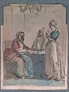 DESSIN ORIGINAL, plume et lavis à l'encre grise, rehauts à l'aquarelle rouge et bleue, papier vergé non filigrané, 10,1 x 7,7 cm, fixé par le bord inf. sur support, sous passe-partout (coins sup. coupés, traces de montage au verso dans le haut).