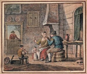 [Attribué à BEGA, Cornelis (1620-1664)].- Famille de paysans avec enfants assis devant la cheminée.