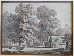[1re moitié du 18e siècle]. DESSIN ORIGINAL, plume à l'encre bistre, pinceau et lavis à l'encre grise, papier vergé, 17,8 x 24 cm (à vue) (5 pet. taches à dr.). Sous passe-partout, vitre et cadre de bois doré (non désencadré).