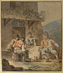 [Suiveur de OSTADE, Isaak van (1621-1649)].- Voyageurs et paysan devant une auberge.