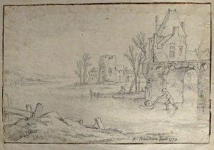 DESSIN ORIGINAL, pierre noire, papier vergé, 21 x 31 cm, signé et daté "f. Bauduins fecit, 1759" en bas à dr., collé en plein sur f. de support.