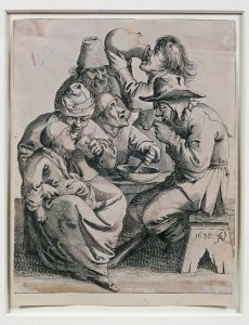 1638. Eau-forte, papier vergé, 20,2 x 15,6 cm, fixée par les coins sup. (rognée sur TC en haut et à dr. et à g. avec pet. perte, faibles taches en haut à g. et en bas). Sous passe-partout, vitre et cadre de bois brun (non désencadrée). # Hollstein 33.