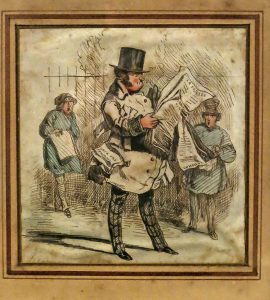 DESSIN ORIGINAL au trait à l'encre de Chine et rehauts à l'aquarelle bleue et crayon rouge, sur esquisse à la mine de graphite, 13 x 12,5 cm, sur papier vélin, non signé (attribution ms. à Gavarni dans le coin inf. g.). Sous vitre, passe-partout et cadre de bois mouluré doré. Assailli par deux vendeurs de journaux à la criée, un bourgeois tient trois journaux en main tandis que de ses poches sortent d'autres journaux.
