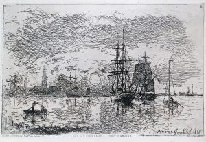 JONGKIND, Johan-Barthold (1819-1891).- " Soleil couchant. Port d'Anvers".