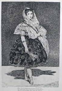 Paris, Cadart & Luquet (imprimerie A. Delâtre), [ 1863]. Eau-forte, cuv. 26 x 18 cm, papier vergé non filigrané, 53,5 x 36,8 cm (qqs piqûres marg.). D'après le célèbre portrait peint figurant Lola Melea, ballerine espagnole qui, avec sa troupe, visita Paris en 1862. Accompagnée du quatrain de Baudelaire, "Entre tant de beautés que partout on peut voir [...]", gravé dans le cuivre.