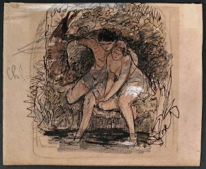 DESSIN ORIGINAL, plume et pinceau à l'encre bistre sur traits de crayon, rehauts de gouache blanche et de crayon, papier vélin, 13,3 x 16,5 cm, sous passe-partout.