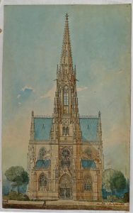 1868. AQUARELLE sur traits à la mine de plomb, sur papier vélin doublé de fin Japon, 38,3 x 24 cm, échelle des mesures à l'encre rouge terminée par la mention "Fl. RhI", signé et daté à la plume en bas à dr. "Wendeler. autio. * gez. 1868". Fine architectural drawing of the principal facade with central entrance of a church building in neo-gothic style. Watercoloured.