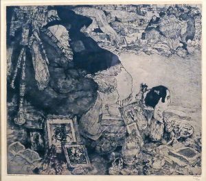 [ 1926]. Eau-forte, pointe sèche [et aquatinte ?], cuv. 43,7 x 49,7 cm + petites marges apparentes, sur Japon teinté, titré "marchands de vieilleries Gand" en bas à g., signé et justifié 25/100 en bas à dr. (effet de brunissure renforcé par le Japon teinté). Sous vitre, passe-partout de toile écrue et cadre de bois mouluré doré. État définitif. Épreuve justifiée conformément au tirage annoncé par Le Roy. Fidèle aux endroits qu'il aime et aux gens dont le physique l'émeut, De Bruycker a immortalisé le brocanteur Jacobus Alijn. À côté de lui, un personnage avec cape noire qui apparaît dans diverses autres de ses gravures (L.R. 24, 26, 27 et 32).