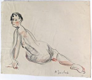 [C. 1930]. DESSIN ORIGINAL, crayon gras noir et sanguine rouge, papier vélin mince, 20 x 24 cm, signé "A. Jouclard" en bas à dr. (faibles plis).