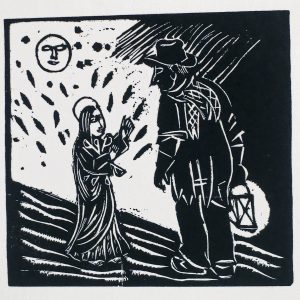(1). Marché aux puces. Pointe sèche, 15, 2 x 21 cm, sur vélin à bonnes marges, signée en bas à dr. Parue dans l'album "Aspects de Bruxelles", 1940; # Taillaert 94.-- (2). Triptyque de Noël. Bois en noir, 11,5 x 12 cm, sur papier feutré crème à bonnes marges. Tirage isolé d'un des trois bois illustrant le texte de Félix Timmermans traduit par Marie Gevers en 1935; # Taillaert 88.