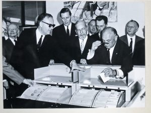 Circa 1955-1965. +/- 260 photographies en noir, 8,5 x 12 cm, collées en plein sur ff. de support, non légendées sauf quelques-unes dont 2 datées. Dans un album ad hoc in-4° carré : plein plastique vert foncé à impression cuir. Si l'homme est non identifié, des petits détails dans les photos permettent de situer son action soit comme patron d'industrie (directeur de la FEB ?), comme dirigeant de l'ONEM, créée en 1961, ou de l'ONPC (cfr panneaux sur le chômage en arrière-plan) ou travaillant dans le domaine de la sécurité au travail (cfr panneaux sur les moyens de se protéger). Plusieurs photos ont été prises au Heysel (Atomium déjà construit), d'autres au Blvd de l'empereur (où se trouvent les bureaux de l'Onem) ou à diverses inaugurations, salons, lors de la remise de médailles (du mérite ? du travail ?). Une photo avec Antoon Spinoy (ministre des Affaires économiques et de l'Énergie, 1961-1965), une autre avec Collé (syndicat libéral). Qqs photos avec le jeune roi Baudouin.