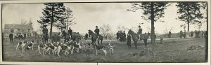 1905-1907. 24 photos, 17 x 42 cm, en noir, légendées + 2 négatifs (sur la chasse) joints. Rel. de l'époque in-12° oblong : pleine toile vert clair, plat sup. titré en creux "Kodak Panorams" (mention ms. "1905" sur ce même plat). - Chasses (10 photos titrées "Chasses à courre à Suarlée", "Rendez-vous à Soye [et à la Marlayne]", "en Bièvre") avec le duc d'Arenberg, le prince Victor Napoléon, le vicomte de Spoelbergh, le duc d'Ursel, la comtesse Wrangel, Jules de Grandry, Gaston Saint-Paul de Sinçay en maître d'équipage, des photos de la meute, etc.,