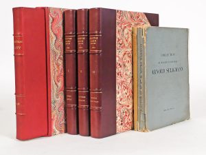 (1). Collection Jacques Doucet. Catalogue des dessins & pastels [- Sculptures & tableaux,- Des meubles & objets d'art] du XVIIIe s. P., Petit, 1912, 3 vol. demi-maroq. prune à coins, couv. cons.-- (2). Catalogue des tableaux anciens. Aquarelles, dessins, gouaches, pastels anciens appartenant à Robert Schumann. P., Girard, 1934, br. (manque dans le haut du dos). Adjudications notées.-- (3). Catalogue des objets d'art et d'ameublement du XVIIIe s. Tableaux anciens, sculptures, estampes anciennes du XVIIIe s. et du début du XIXe s. Collection privée de Mme et M. Arnold Seligmann. P., Lahure, 1935, br. (pet. us.).-- (4). Collection François Coty. Tableaux anciens, pastels, dessins, gouaches, objets d'art et d'Extrême-Orient, objets d'art et d'ameublement du XVIIe et XVIIIe s. P., Lahure, 1936, demi-maroq. bordeaux à coins, couv. cons., sous étui.