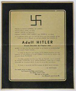 Double page in-8°, bords noirs, en français (papier bruni mais bonne condition). Tract au ton humoristique et amer, annonçant la mort d'Hitler. "La messe de Requiem sera chantée par les célèbres macaronis, qui interprêterons, la fuite d'Afrique et le repli d'Albanie, sous la direction de leur chef bien-aimé Benito Mussolini. Un défilé grandiose aura lieu sous l'Arc de Triomphe, sous la conduite de Monsieur Churchill et du Général Degaule, installé [sic] dans le wagon mémorable de Compiègne-Berlin [...] Les Anglais auront la victoire, Les Français et les Belges auront la gloire, Les Italiens seront la poire, Mais pour ne rien perdre, les Allemands auront de la M....".