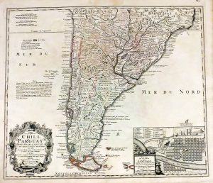 [ Nuremberg,] Homannianis heredibus, 1733. Gravure sur cuivre, TC 48,5 x 56,5 cm + marges, rehaussée à l'aquarelle (pli central). Carte de l'Amérique du Sud entre la Terre de Feu et le Pérou, avec le Détroit de Magellan. Agrémentée d'un cartouche allégorique et d'un plan supplémentaire de la ville de Santiago. Comprend de l'information géographique par le chroniqueur chilien Alonso de Ovalle, Nicolo del Techo, etc. Deuxième édition de la carte publiée par de L'Isle en 1703, probablement extraite de l'"Atlas Geographicus".