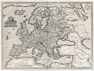 Gravure sur cuivre, 34 x 46,2 cm + grandes marges (pli central, très faible tache au milieu en haut). Carte du continent, variante B (sans privilège; feuillet "2" avec texte latin au verso), à dater entre 1592 et 1609-1612.