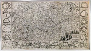 Amsterdam, [F. De Wit, après 1689]. Gravure sur cuivre, TC 49,5 x 89,5 cm (3 cuivres imprimés sur 2 papiers collés). Sous passe-partout, vitre et cadre de métal jaune (non désencadrée). Carte du bassin du Rhin, Moselle, Meuse, Main, Neckar et d'autres petits fleuves. Cernée de 18 plans des villes fortifiées de la région. Agrémentée d'un cartouche avec scène allégorique.