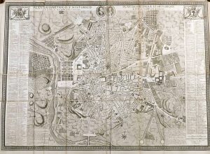 Paris, Sr. Julien, 1761. Gravure sur cuivre, 1 plan en 4 feuillles assemblées, TC 99 x 137,5 cm + marges (plis, taches, bords us.). Grand plan bilingue de Madrid. Légende indiquant les paroisses, couvents, collèges, hôpitaux, églises, chapelles, ermitages, palais, fontaines, etc. Avec les armoiries d'Espagne et de Madrid et 2 médaillons représentant Charles III et Charles IV d'Espagne. Gravé par Nicolas Chalmandrier, qui a contribué à la carte de Cassini.