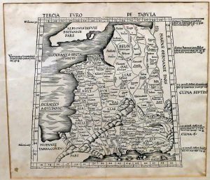 Map of France and its neigbours. Extracted from Ptolemy's "Geographia" published in Strasbourg in 1513. Referring to Ptolemy's system of 7 parallels, Waldseemüller includes 2 "clima" (climes).