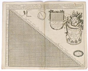 Leyden, Pieter Vander Aa, [c. 1690]. Gravure sur cuivre, TC 42,4 x 53,5 cm + marges (pli central, brunie). Tableau bilingue des distances entre les villes importantes d'Allemagne, Espagne, France, Italie, Angleterre, Pologne et Pays-Bas. Avec une notice d'emploi, une table de Pythagore et les armoiries de Leyden. Gravé par Jan Luyken.