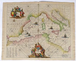[ Amsterdam], L. Renard, [ 1715 ou 1739]. Gravure sur cuivre, TC 47 x 56 cm + marges, rehaussée à l'aquarelle (pli central, pet. taches). Carte marine de la Méditerranée. Agrémentée de deux cartouches allégoriques et d'une légende. "Folio 14" extrait de l'"Atlas de la navigation et du commerce [...]" par Louis Renard. Les cuivres de cette édition proviennent de l'atlas maritime de Frederick De Wit, mais furent corrigés par Renard. La présence de son nom indique que la carte fait partie de la 1re ou 2e édition et non de la 3e par R. et J. Ottens, comme indiqué au crayon au verso.