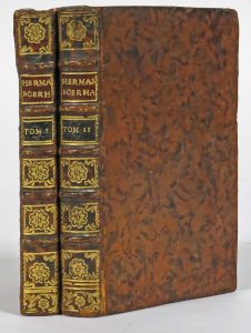 Parisiis [i.e. Leiden ?], s.n., 1724. 2 vol. in-8° : [4]-290, [16]-375 pp.; 1 h.-t. (rares rouss. ou pet. taches marg., mouill. marg. au vol. II). Rel. de l'époque : pleine basane marbrée, plats cernés d'un double filet à froid, dos fleuronnés dorés à nerfs, tr. rouges (lég. épidermures, mors très part. fendus au vol. I, manques aux coupes sup. et 1 coin émoussé au vol. I, mention ms. grattée au verso de la garde du même vol.). ÉDITION NON AUTORISÉE PAR L'AUTEUR, publiée probablement à Leiden, la première édition autorisée ayant paru dans la même ville en 1732 sous le titre d'"Elementa chemiae". Comme cette dernière, celle-ci contient un historique de la chimie et traite du souffre, des pierres, des végétaux, des usages de cette science en médecine, des instruments employés en chimie, du feu, etc. Illustré d'1 in texto et d'1 planche dépliante. Boerhaave (Voorhout 1668-1746 Leiden), professeur de médecine et de botanique à Leiden, est considéré comme le fondateur de l'hôpital académique moderne et de la médecine clinique.