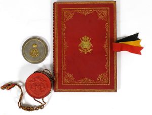 Bruxelles, 25 septembre 1882. In-f° : [4] ff., sur peau de vélin, 34 x 24 cm, armoiries peintes (10 x 12 cm). Rel. de l'époque : chagrin rouge, plats cernés de roulettes et de fins fleurons dorés avec armoiries de la Belgique frappées or au centre, roulettes dorées sur les coupes et remplis, gardes de papier moiré blanc, dos lisse, cordons de soie tricolore reliées au sceau appendant en cire rouge (diam. 11 cm), sous boîte en métal argenté et doré au monogramme de Léopold II, rubans de fermeture aux couleurs nationales. Sous boîte en cuir noir doublée de velours violet (cuir frotté).