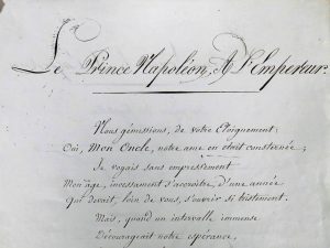 Écrits à l'occasion de fêtes ou d'anniversaire, la plupart des papiers sont des poésies rédigées par les précepteurs ou l'entourage des enfants d'Hortense et destinées à être lues ou récitées par les enfants à leur mère, dite "la Reine", à Napoléon, dit "Mon oncle" ou "mon-noncle", à l'impératrice Joséphine, dite aussi "ma tante" ou "Grand'maman", etc. D'autres sont des petits dialogues ou petites scènes destinés à être joués par les enfants parmi lesquels une "Scène pour Malmaison" avec comme personnages Charles et Gustin, jardiniers de la serre de Malmaison, et M. de de Mailly (4 pp. in-f°),- une "petite scène pour Ste Eugénie" datée de St Leu (à côté d'Arenenberg), novembre 1812, avec comme personnages Mme de Mailli, le prince Napoléon en maître d'école et le prince Louis, son élève (4 pp. in-f°),- et enfin "L'Almanach de Liège. Scène jouées dans le sallon de la Reine, le lundi 12 janvier 1813" joué par les princes Napoléon et Louis, Hortense Boucheporn, Léon, Aloys et Eugène Ney (10 pp. in-f° avec papillons correctifs).