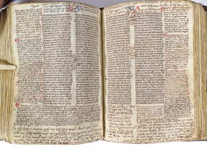 [ Pays-Bas de l'est (?), début du 15e siècle]. In-12° (14,5 x 10,7 cm) : [226] ff. (marges inf. de c. 10 ff. coupées, perforations dont qqs-unes dans le texte, annotations sur les gardes et dans le texte, 2 croquis au crayon sanguine du 19e s.). Rel. moderne dans le style 15e-16e s. : plein veau brun sur ais de bois, plats ornés à froid de losanges avec fleuron central, dos à nerfs (mors sup. partiellement fendu, pet. manque aux coiffes, cordons manquants). Précieux manuscrit en "littera textualis" (justification 9,2 x 6,3 cm; 2 colonnes de 39 lignes), agrémenté de titres courants, de lettrines ornées, d'initiales et de lombards à la plume bleue et rouge. Bible à situer dans la tradition de la "Dévotion moderne", mouvement spirituel fondé par Geert Groote (1340-1384) à Deventer. Exemplaire amplement annoté en latin par une main de l'époque, parfois sur des pages entières.