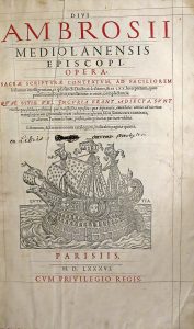 Parisiis, [apud societatem magnae navis Jacques du Puis, Sebastien Nivelle, & Michel Somnius], 1586. 5 parts in 2 vol. in-f° (text n.c., some lvs slightly browned, handwritten provenance crossed off title-page of vol. I, some light marginal dampstains, stronger at the end of vol. I, joint reinforced at the col. I-143/146, some handwritten notes in vol. I, 13 first lvs of vol. II trimmed, title and table of contents of vol. II doubled and remounted, holes in the col. II-98 without lacks). 19th centubry binding : half sheepskin, brown marbled paper boards, gilt ribbed spines, red edges (corners renewed, dampstains on the boards of vol. I, leather of the spines partly unstuck, stronger in vol. I, joints partly split, renewed in vol. II...). VERY RARE EDITION given by Felix, cardinal of Monte Alto, containing commentaries with extracts of the Bible, sermons on the Psalms and on the viriginity, letters and funeral orations of Theodosius the Great and Valentinian II. Ambrosius (340-397) was the bishop of Milano, from 374 to 397, and one of the four Church Fathers. This copy belongs to the first works printed by the "Compagnie de La Grand'Navire", a French group of printers which published since 1586 works of the Church Fathers and on canon laws. Illustrated with some head-pieces (one representing the Four Church Fathers in a medallion) and large vignettes on title-pages of the "Compagnie de La Grand'Navire", figuring a large boat, symbol of Paris, with fleur-de-lys on the sails and monograms in the center and on the front. Copy LINED WITH PEN in a neat typography.