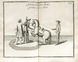 Nürnberg, Johann Ziegers und Georg Lehmanns, 1700. In-f° : [30]-301 pp.; 82 h.-t. (qqs déch. surtout marg., 1 restaurée, qqs pâles ou pet. mouill. marg., qqs taches marg.). Rel. de l'époque : plein vélin de récupération (partitions musicales mss) à couture apparente, dos lisse, tr. jaspées de bleu (rel. frottée par endroits, pet. parties fendues). Première édition juxtalinéaire allemand et français accompagnée de notes et remarques par Jacques de Solleysel (éd. orig. traduite sur le manuscrit anglais : Anvers, Van Meurs, 1657). Illustré des armoiries du dédicataire à pleine page, de schémas in texto et de 82 jolies planches sur doubles pages ou dépliantes gravées d'après Abraham Van Diepenbecke. Traite des différentes races de chevaux, de la façon de connaître leur âge, des recettes pour faire pousser les crins, des sauts, des méthodes pour les éduquer, les faire obéir au talon, rendre leurs épaules souples au trot et au petit galop, etc. Texte sur deux colonnes en caractères romains ou gothiques et titre allemand en rouge et noir. Newcastle (1593-1676), soldat et politicien, vécut désargenté et en exil à Anvers après des revers politiques. Il rentra en Angleterre après la Restauration où sa fidélité au roi fut récompensée. L'édition anglaise parut seulement en 1667.