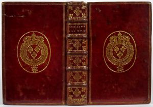 Rel. armoriées de l'époque : plein maroquin rouge, armoiries dorées au centre des plats cernés d'une roulette, dos à nerfs aux caissons fleurdelisés dorés, filet ou roul. dorés sur les coupes et remplis, tranches dorées sur marbrures. (1). Paris, Antoine Dezallier, 1701, in-8° (rouss., pet. manque à la coiffe sup., pet. éraflure). Reliure aux armes de Louis XIV (variante); ex dono ms. au "curé d'Aulnoy les Bondy par son compagnon d'infortune pendant la guerre de 1870 & 1871". La forêt régionale de Bondy est située sur un plateau dominant le pays d'Aulnoye. -- (2). Paris, Grégoire Dupuis, 1724, in-8° (pet. coups au plat inf.). Rel. aux armes de Louis XV (variante).-- (3). Paris, Gissey, 1743, in-16°, sous étui de papier (postérieur). Rel. aux armes de Marie Leczinska reine de France.
