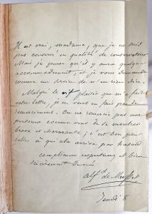 ENRICHI d'une LETTRE AUTOGRAPHE signée de Musset à une correspondante non identifiée (Sand ?), 1 p. in-12°, "Jeudi 8", s.d. (pet. déchirure au pli, 1 pli restauré) : "Il est vrai, Madame, que je ne suis pas conservé en qualité de conservateur Mais je pense qu'il y aura quelque accommodement, et je vous demande comme un service de n'en rien dire. Malgré le VIF plaisir que m'a fait votre lettre, je ne vous en fais pas de remerciemens. On ne remercie pas une personne comme vous de se montrer brave et charmante; c'est bon pour celles à qui cela arrive par hasard. Complimens respectueux et bien sincèrement dévoués".