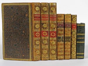 MONTESQUIEU, Ch.-L. de Secondat, baron de.- Lettres persanes. Dijon, Frantin, 1797, 3 vol.-- Le chansonnier des belles. P., Louis, 1821. Front. et vignette sur le titre.-- DEMOUSTIER, Ch.-A.- Lettres à Émilie sur la mythologie. P., Dabo-Butschert, 1825, 6 parties en 2 vol. (mouill.). Ill. de 6 h.-t. rehaussés (dont 1 collé sur un papier différent).-- La Goguette ancienne et moderne. Choix de chansons. P., Garnier, 1851. Titre gravé.