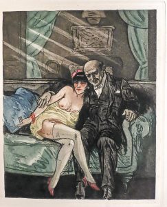 Paris, Aux éditions d'art de l' Intermédiaire du Bibliophile, 1929. Pet. in-f°. Rel. de l'époque : demi-maroquin vert malachite à coins, dos à nerfs et caissons mosaïqués ou fleuronnés, tête dorée, couv. et dos cons. Sous étui (abîmé). ÉDITION ORIGINALE illustrée de 16 eaux-fortes et aquatintes en couleurs à pleine page (dont la couv.) et d'1 bandeau et 1 cul-de-lampe en noir. Après Lautrec, Rops, Vertès, Dignimont, Courbouleix dessine ces lieux clos où "la femme circule sans voiles". Accompagné d'une étude de Hesse sur ces "Maisons d'illusions ! On pourrait plutôt les nommer maisons de désillusions !" (p. 6). Tirage à 111 ex. num., un des 85 sur Rives teinté (n° 69) accompagnés d'1 suite avec remarques du bandeau et du cul-de-lampe.