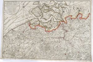 London, [W. Faden], 1789. Gravure sur cuivre, TC 61 x 92 cm + marges, limites rehaussées à l'aquarelle (pli central). Carte de la frontière entre les Pays-Bas autrichiens et les Provinces-Unies. Faden (1749-1836) a publié l'oeuvre de plusieurs cartographes européens dont cette copie réduite de la carte de J.J.F. de Ferraris.