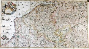 Paris, chez l' auteur, 1742. Gravure sur cuivre en 6 ff., cuv. 96,5 x 180 cm + marges, rehaussée à l'aquarelle (plis, brunie, pet. déch.). GRANDE CARTE de la Côte d'Opale et la Côte belge, de Dieppe à Vlissingen, y compris toute la Belgique et limitée à l'est par Venlo dans le nord et Arlon dans le sud. Agrémentée d'un cartouche en forme de coquille avec les armoiries du dédicataire, le marquis de Vastan. Extraite de l'"Atlas factice de cartes vendues par Le Rouge".
