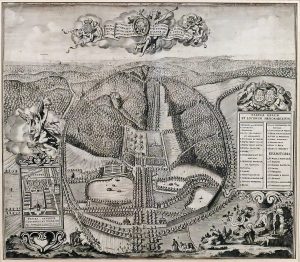1692. Eau-forte, TC 53,7 x 61,3 cm + marges (pet. déchirures marg. sans perte). Sous passe-partout, vitre et cadre de métal doré (non désencadrée). RARISSIME PLAN du couvent des Carmes déchaussés de Nethen à Grez-Doiceau (Brabant wallon) par Gaspar Bouttats (1625-1703). Première représentation de l'important mur de clôture construit par les carmélites autour du Château de Savenel. Le carmel a été fondé en 1680 par les carmélites espagnols dans les bois de Nethen comme "desierto", carme dans le "désert". Avec vue supplémentaire du couvent et de l'église, noms et localisation des ermites.